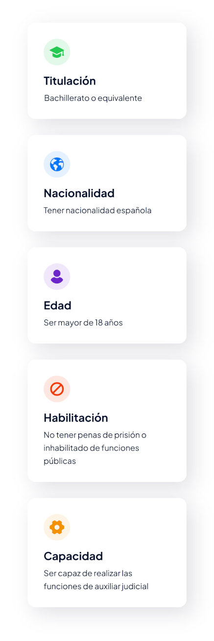 - Certificado médico: Debe acreditar tu capacidad funcional para desempeñar las funciones como auxiliar judicial.